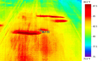 使用紅外攝像機(jī)拍攝全車道輻射數(shù)據(jù),顯示潛在分層??梢孕薷挠覀?cè)的溫度標(biāo)度,以優(yōu)化橋面/路面的紅外顯示。