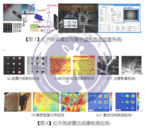 紅外熱波雷達與頻域復(fù)合調(diào)制熱波成像技術(shù)采用單色激光源或鹵素光源激勵樣件,利用樣件吸收激光或白光產(chǎn)生光—熱效應(yīng)的時頻特征進行缺陷診斷與性能分析。開發(fā)了紅外熱波雷達與復(fù)合調(diào)制熱波成像檢測系統(tǒng),利用互相關(guān)與時頻分析技術(shù)提取熱波信號時頻域特征,可實現(xiàn)微缺陷及內(nèi)部結(jié)構(gòu)層析成像。該技術(shù)應(yīng)用于航空航天、汽車、半導(dǎo)體材料及生物材料/工程等領(lǐng)域。